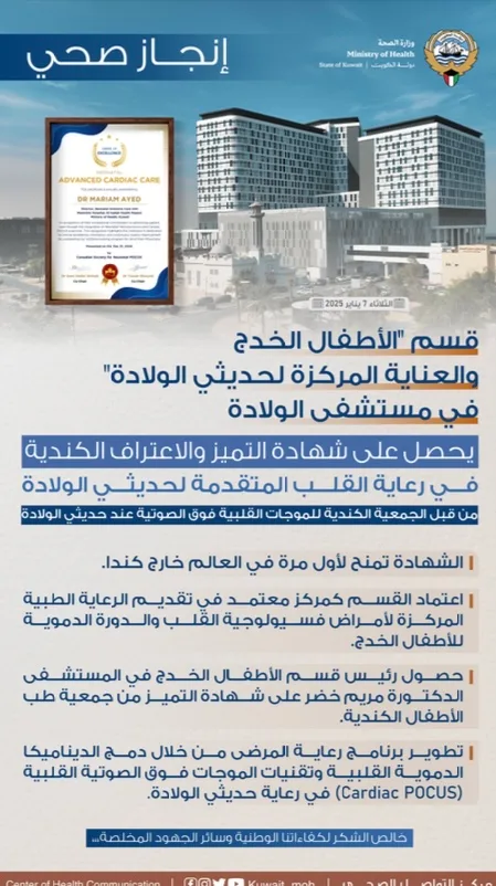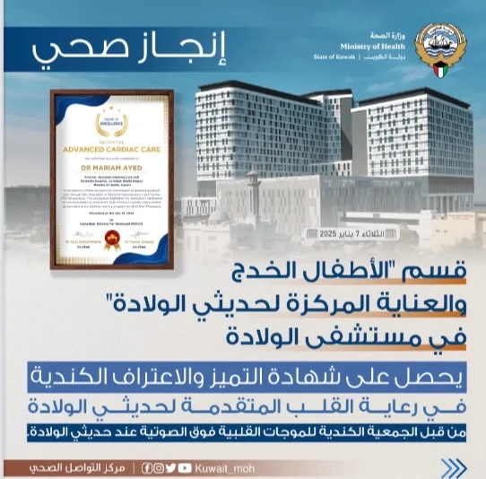وأوضح الدكتور السند أن هذا الإنجاز يعكس التزام وزارة الصحة بتعزيز جودة الرعاية الصحية المقدمة للأطفال الخدج، حيث تم اعتماد القسم كمركز متخصص في تقديم الرعاية الطبية المتقدمة لأمراض فسيولوجية القلب والدورة الدموية لهذه الفئة الحساسة.