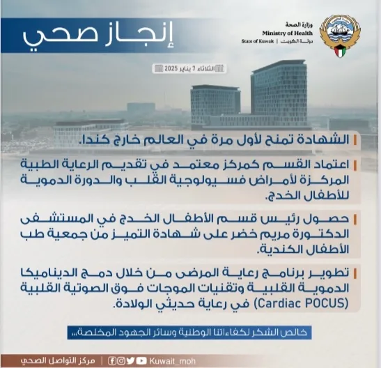 كما أشار السند في السياق ذاته، إلى أن رئيسة القسم، الدكتورة مريم خضر، حصلت على شهادة التميز من الجمعية الكندية لطب الأطفال، تقديراً لدورها البارز في تطوير برنامج رعاية المرضى من خلال دمج تقنيات الديناميكا الدموية القلبية والموجات فوق الصوتية القلبية (Cardiac POCUS) في رعاية حديثي الولادة، ما يعزز الكفاءة التشخيصية والعلاجية المقدمة للمرضى.